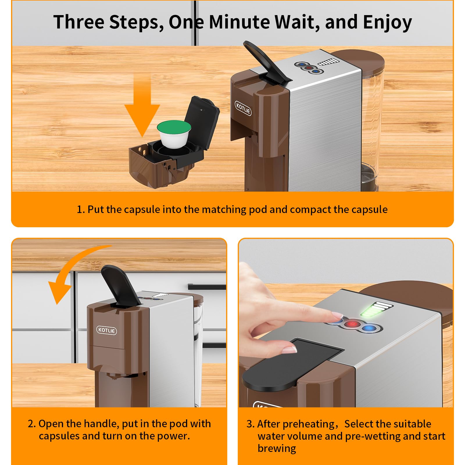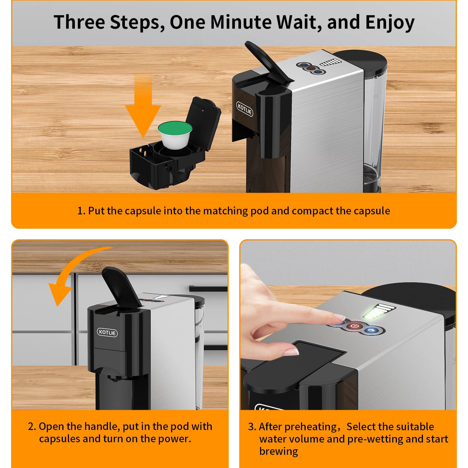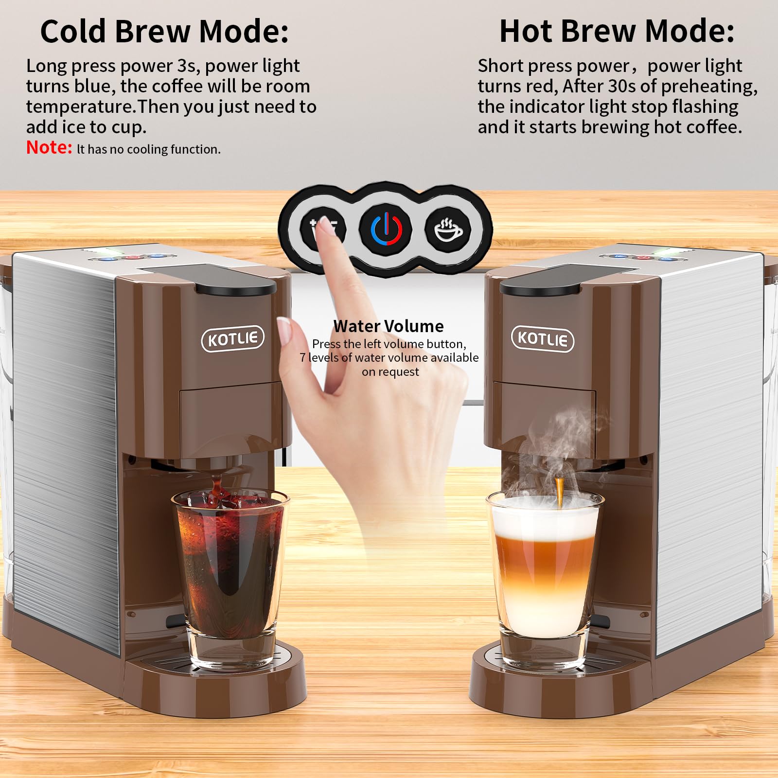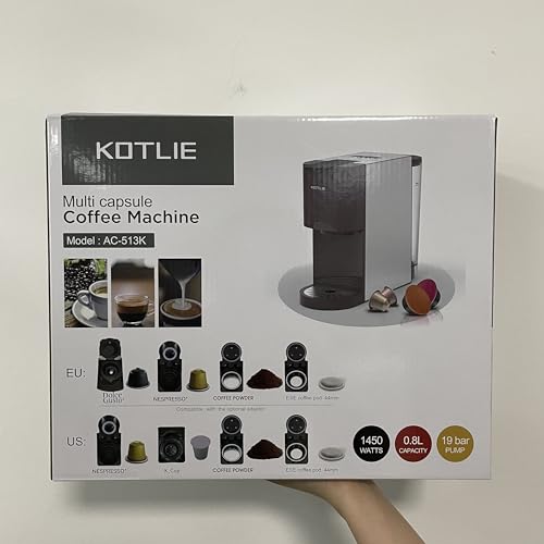 Discover the ultimate all-in-one coffee solution with the KOTLIE AC-513HF. This 19-bar espresso machine brews your favourite drinks from six different capsule systems or ground/ESE pods, while its upgraded adjustable base and large drip tray accommodate every cup size—from espresso shots to travel mugs.