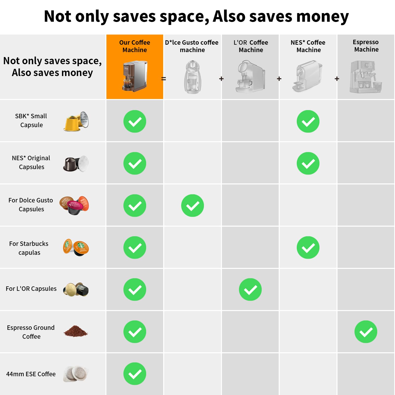 - 5-in-1 Compatibility: Brew seamlessly with Nespresso Original, Dolce Gusto, Lavazza Mio, L’OR, ground coffee and ESE pods.