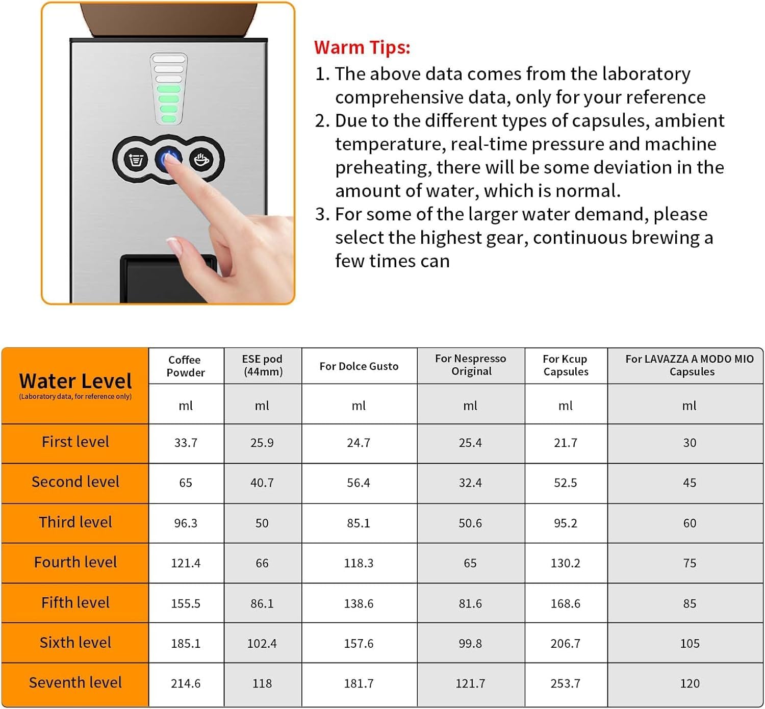 | Compatibility | Nespresso Original, Dolce Gusto, Lavazza Mio, L’OR, Ground & ESE Pods |