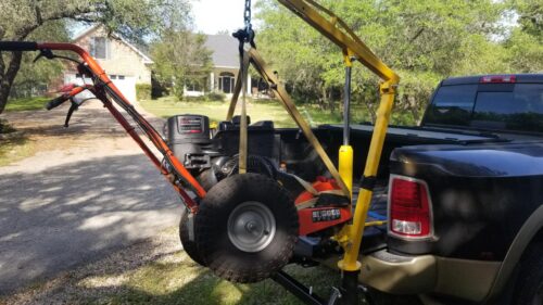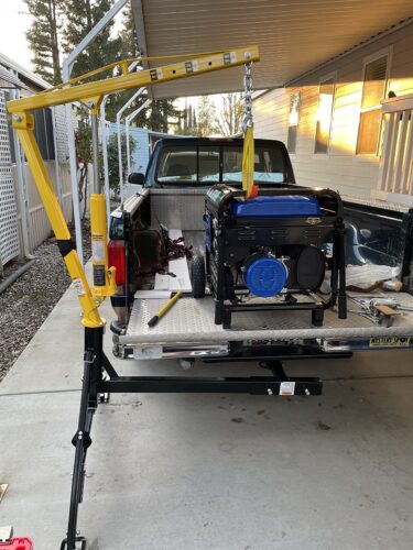 So, I bought this Maxxhaul hitch-mounted crane. And it works pretty slick. I will say that it's way heavier than I expected ... but that can't really be avoided: it's lifting heavy stuff, so it has to be pretty heavy duty, itself. And, even when "broken down" for traveling, it's still a bunch of pieces. But it all goes together pretty quickly -- maybe takes me 2 minutes to set it all up on-site, and another 2 to take it apart when I'm done.