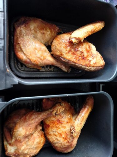 As my images show, this "compact cooker" roasts some great chicken quarters. The same applies with the chicken as it does the duck, partially roast the chicken and finish off using the max crisp setting which operates at 240c and that is 10c higher than domestic ovens so it cooks and crisps skin perfectly and quickly.