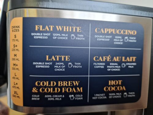 A very versatile machine, it gives you a beautiful expresso and the options for that are: Expresso, Quad and cold pressed. The Coffee options are: Classic, Rich, Over Ice and Cold brew and you have a milk froth option, from 1 to 4. There's also the grind, giving you the rather intuitive automatic one or up to 25 of your own. As previously said, you can make Americano's, Cappuccino's etc but if you're new to coffee machines you might want to look at a guide for this, but it is easy enough. 9/10