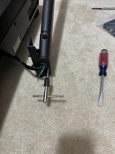 Once I got all the pieces inside, it was time to start assembling. The instructions are well written and it was mostly clear what had to be done. Unfortunately, I hit a snag on step 4. I got the wire through the upright and the grommet installed with little problem. The next step was to remove the screw that they used to hold the wire tie in the upright and use a different screw to attach the ground wire to that hole. The ground wire screw would not thread into the hole. The proper screw is, of course, a machine screw, but the temporary screw they had in the hole was not. It was a completely different thread and it boogered up the first thread or two in the upright.