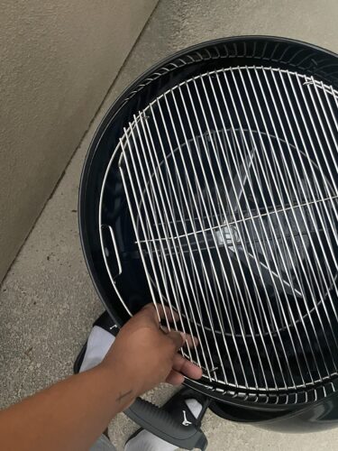 - I then put the cooking grate in the grill and put the lid on the grill and let it get hot for 15 minutes. This allows the fire to make the cooking grate hot and easier to clean. Once I finish cleaning the cooking grate, I adjust the vents from full open to half open to bring the temp down.